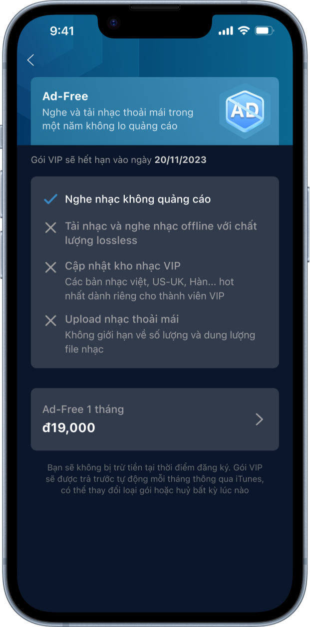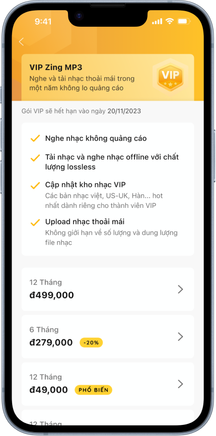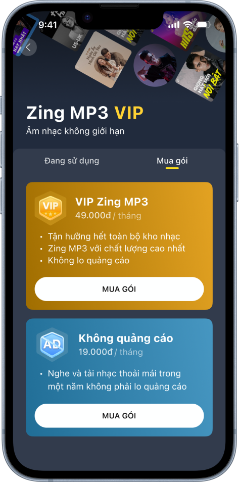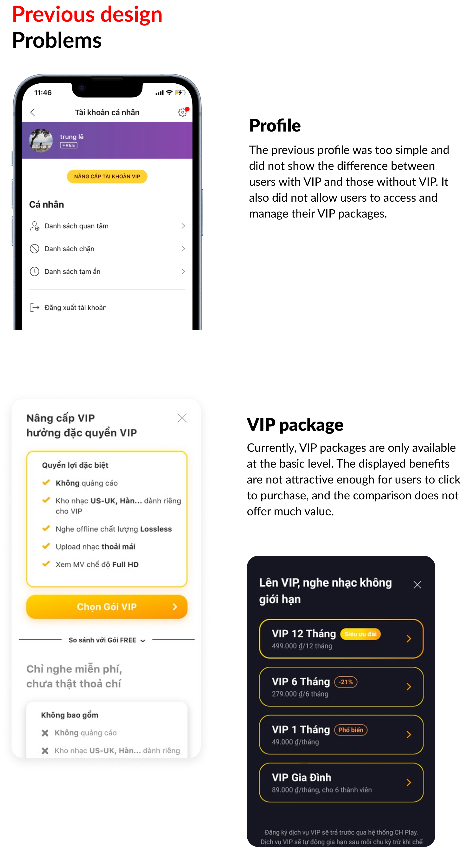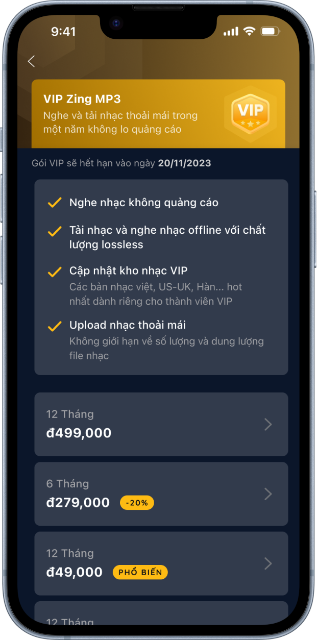 In the "Purchase VIP" tab, there are different VIP packages because some users may not use all the features of the premium VIP package. Initially, we created two VIP packages: "Premium VIP" and "Ad-free" (listening to music without ads), and in the future, we will create more VIP packages that are suitable for each user's needs.