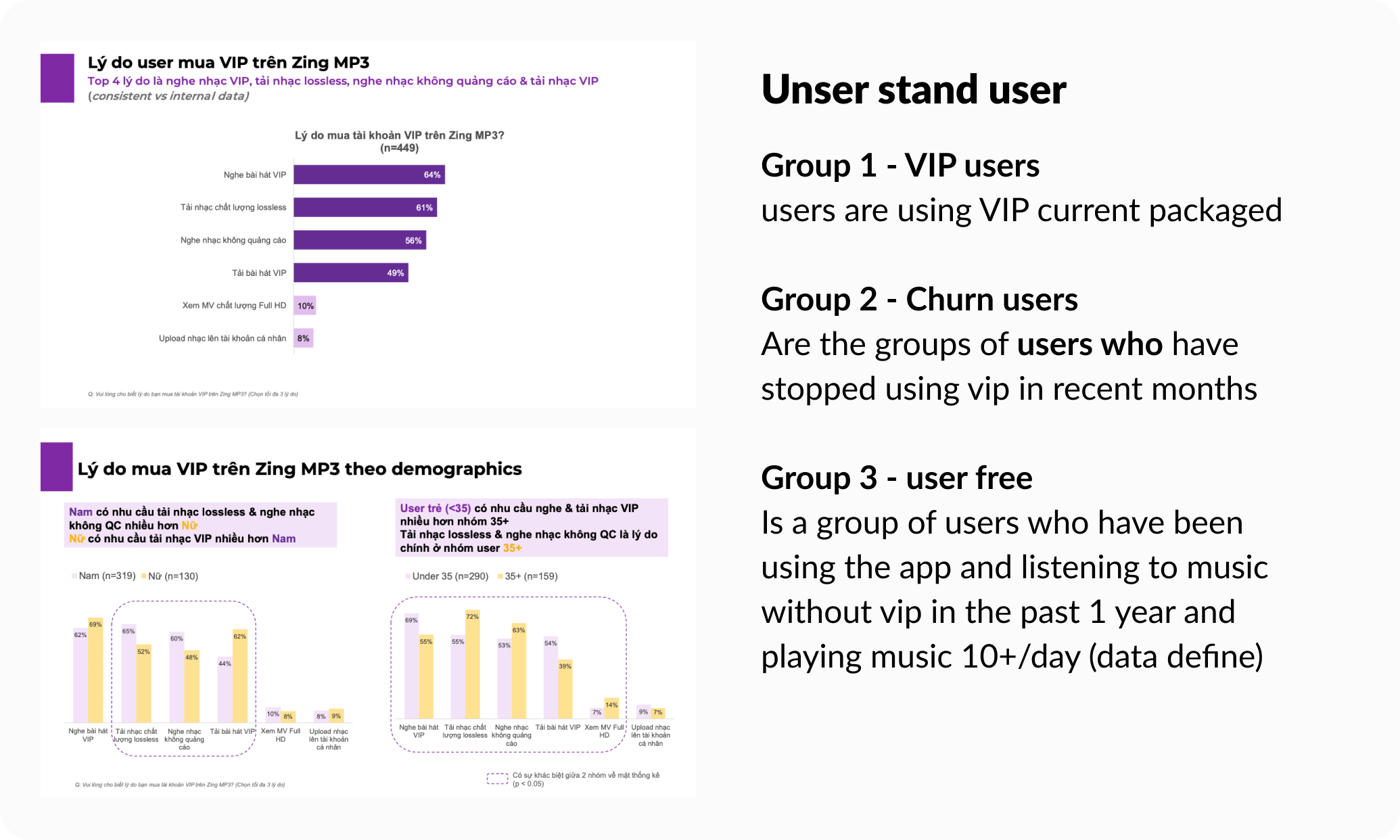 Currently, Zing mp3 has introduced a VIP upgrade feature, but the user paying rate is only at 0.1% which is very low compared to other music streaming apps. Therefore, the product team wants to reevaluate the value of the current VIP package with users to gather information as a basis for improving the subscription rate.